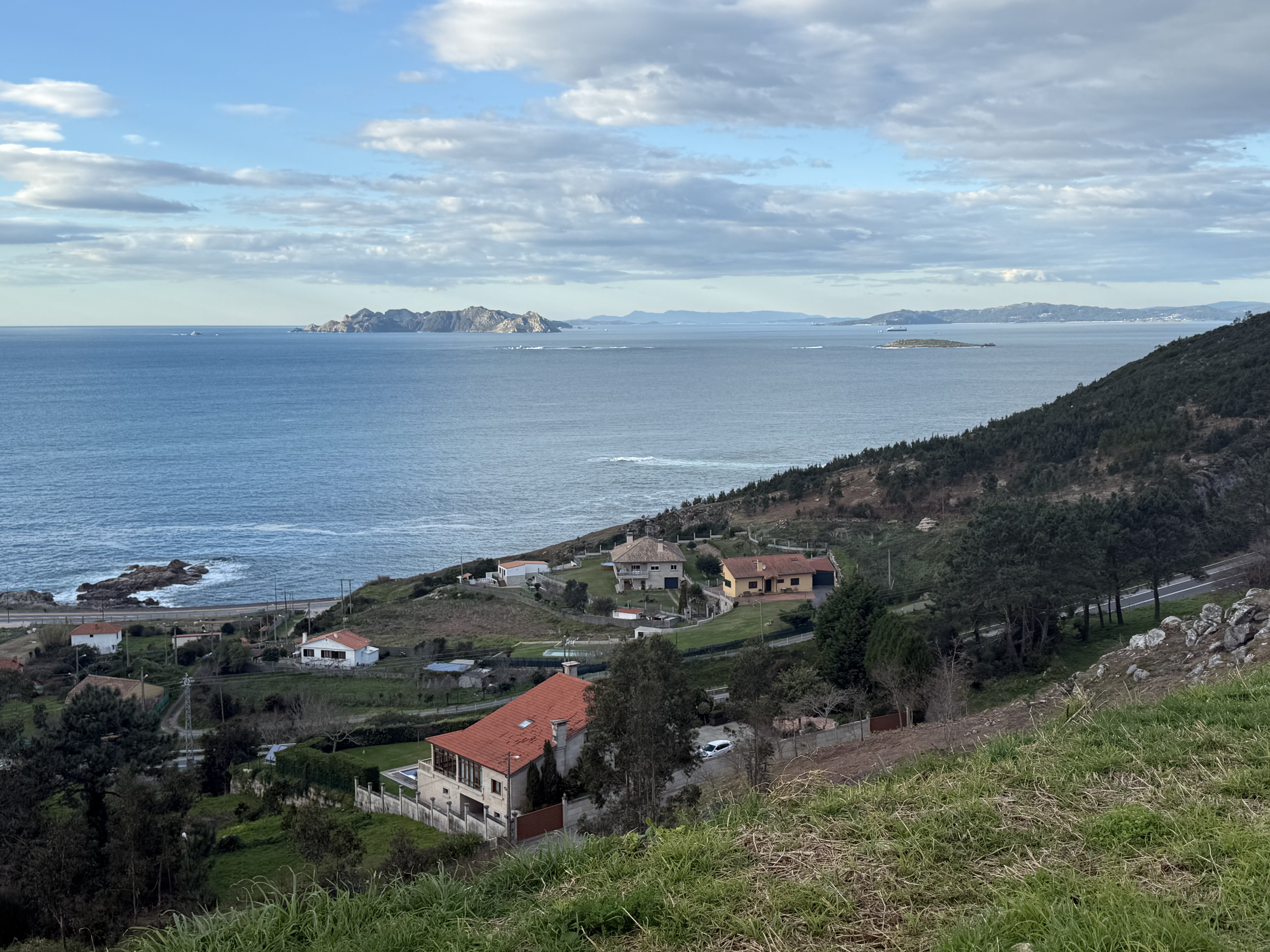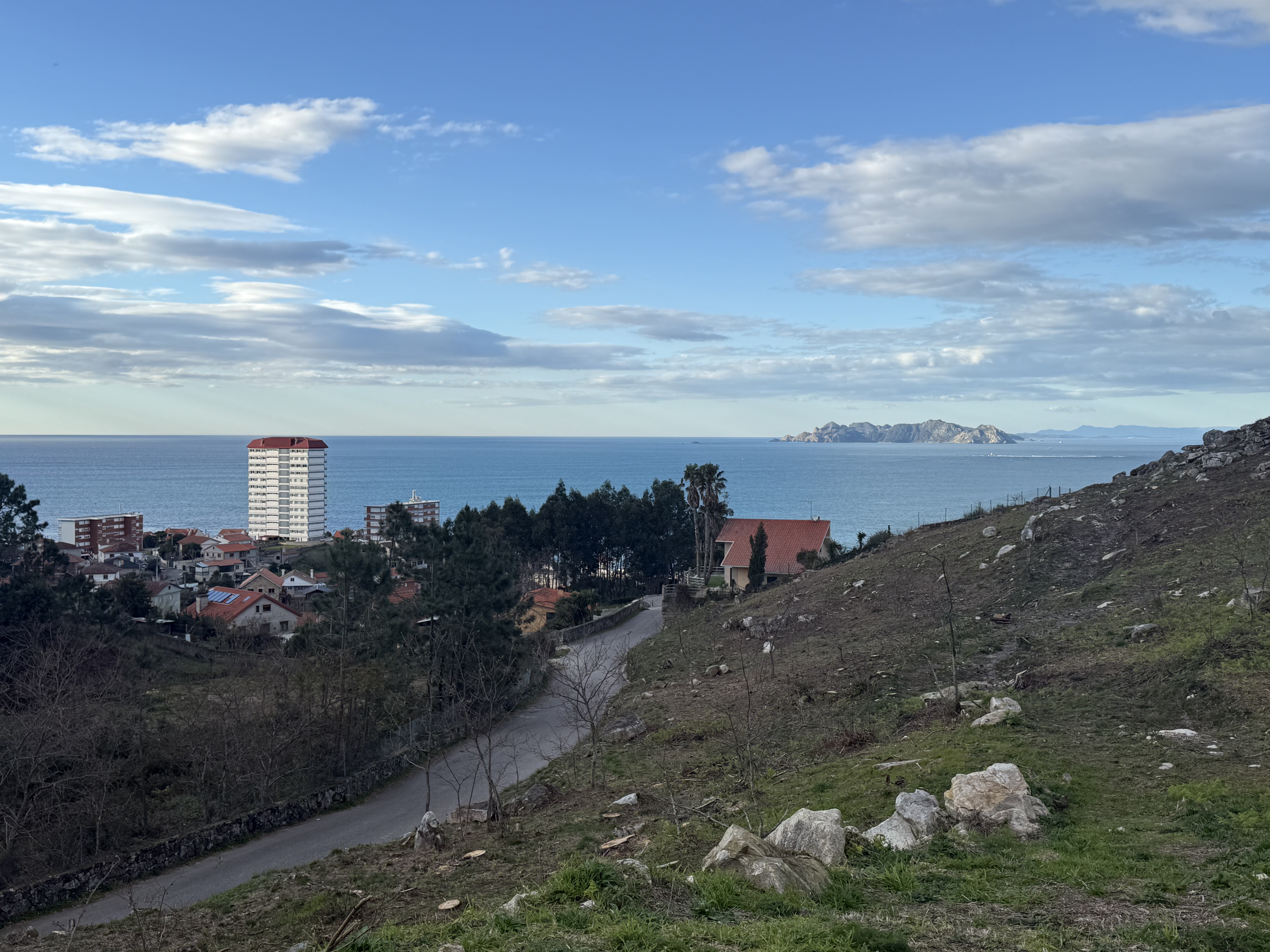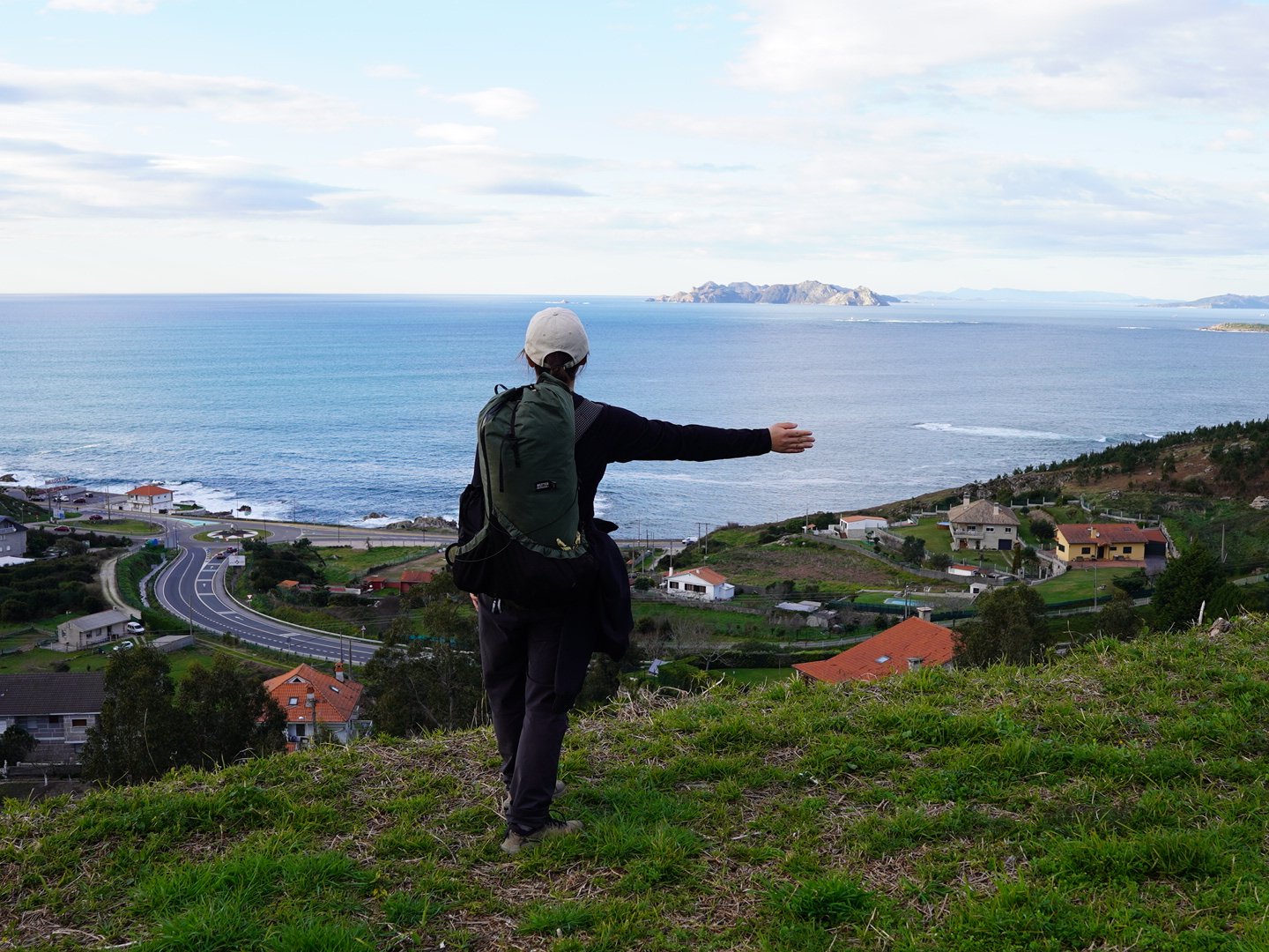 그러다가 또 다시 언덕을 오르라는 순례길 코스를 따라 계단을 올라 전망대로 가는데.. 아 이래서 이곳으로 순례길을 만들었구나 100배는 이해가 갈 뷰가 눈앞에 펼쳐졌다. 어린 커플의 애정행각을 피해 전망대에 들어서니 저 멀리 비양도가 연상되는 섬과 해안가 교차로 도로가 내려다보였다.