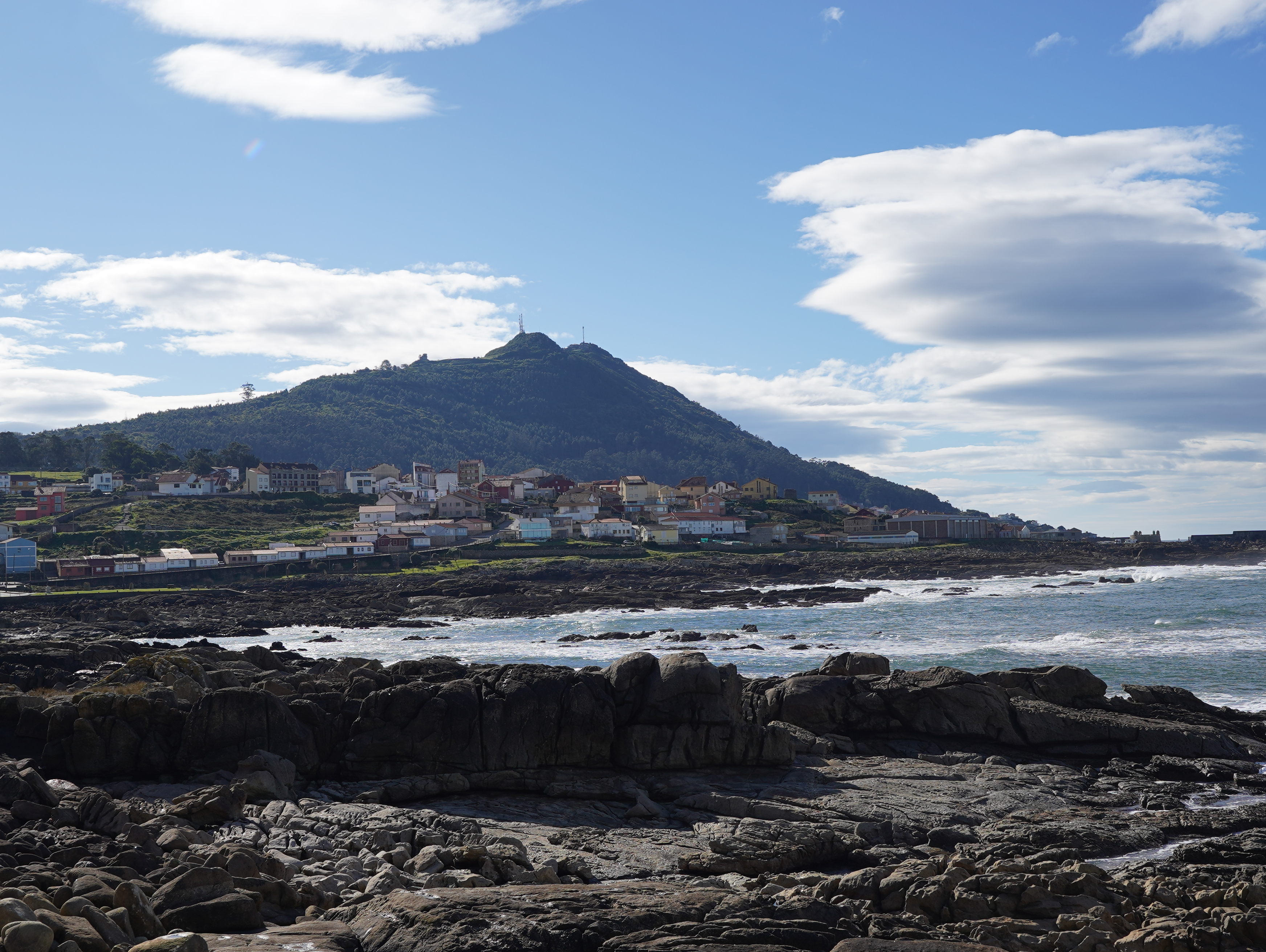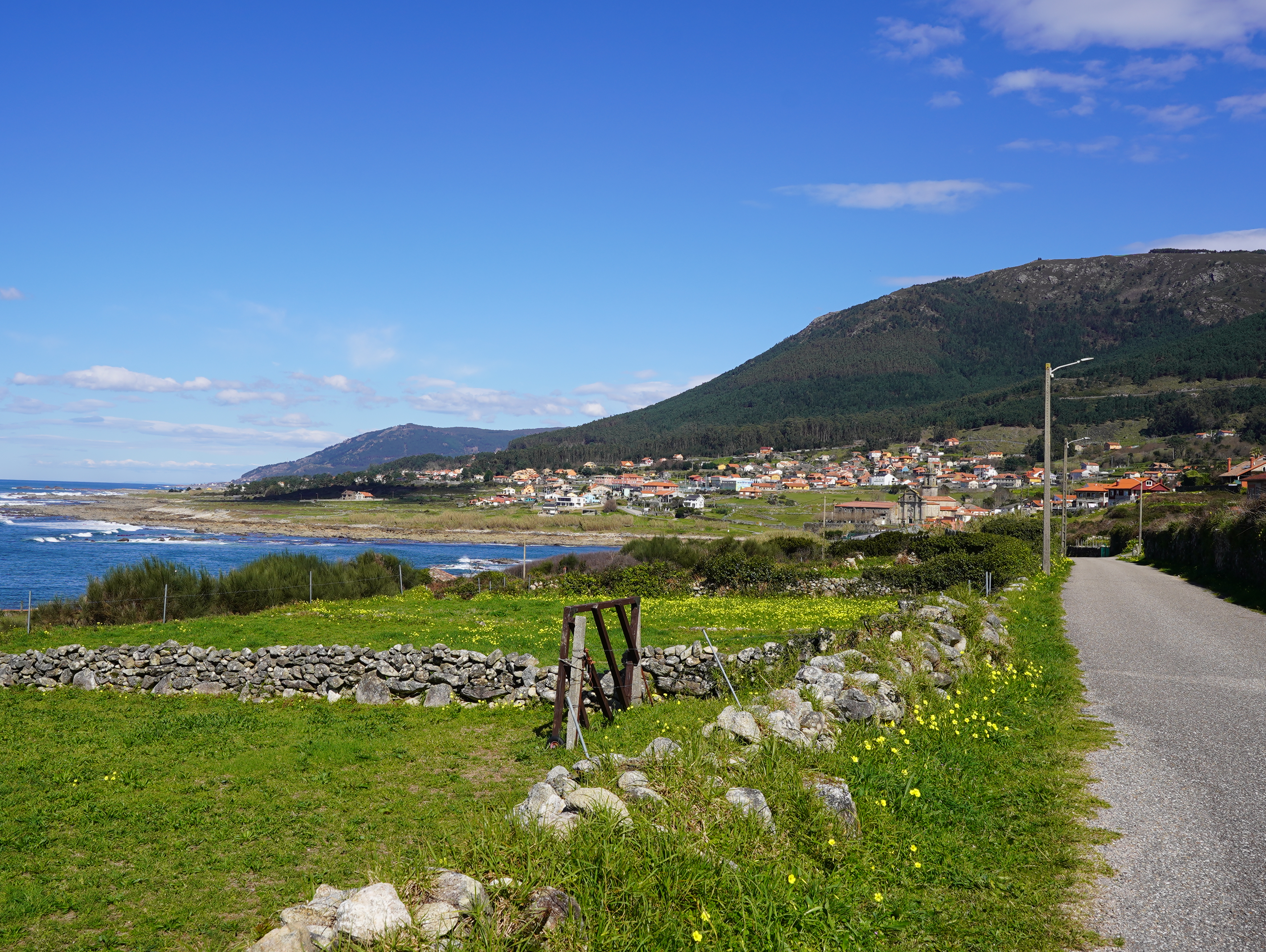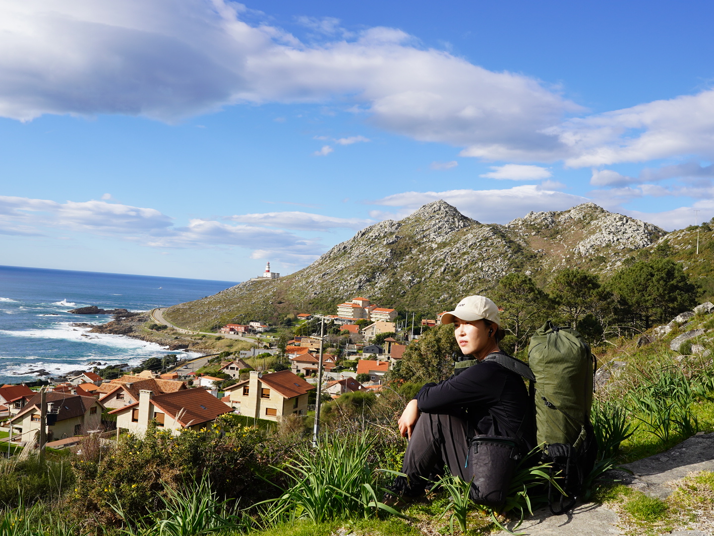 그렇게 Porto Mougas 마을의 아름다운 돌맹이 그림을 지나서 어느덧 산길로 접어들었다. 어디러 가는거지.. 30km 정도에 도달한때라 꽤 지쳐있었는데 점점 산으로 올라가는걸 보고 속으로 내가 너무 욕심을 부렸나.. 그런 생각이 들었다. 그럼에도 바로 앞에 보이는 돌산과 빨간 등대가 너무나 예뻐보였고 아래로 내려다보이는 바다와 해안가 마을이 열배쯤 더 멋져보였다. 역시 높은 곳에서 내려다보는게 제일 멋지다.