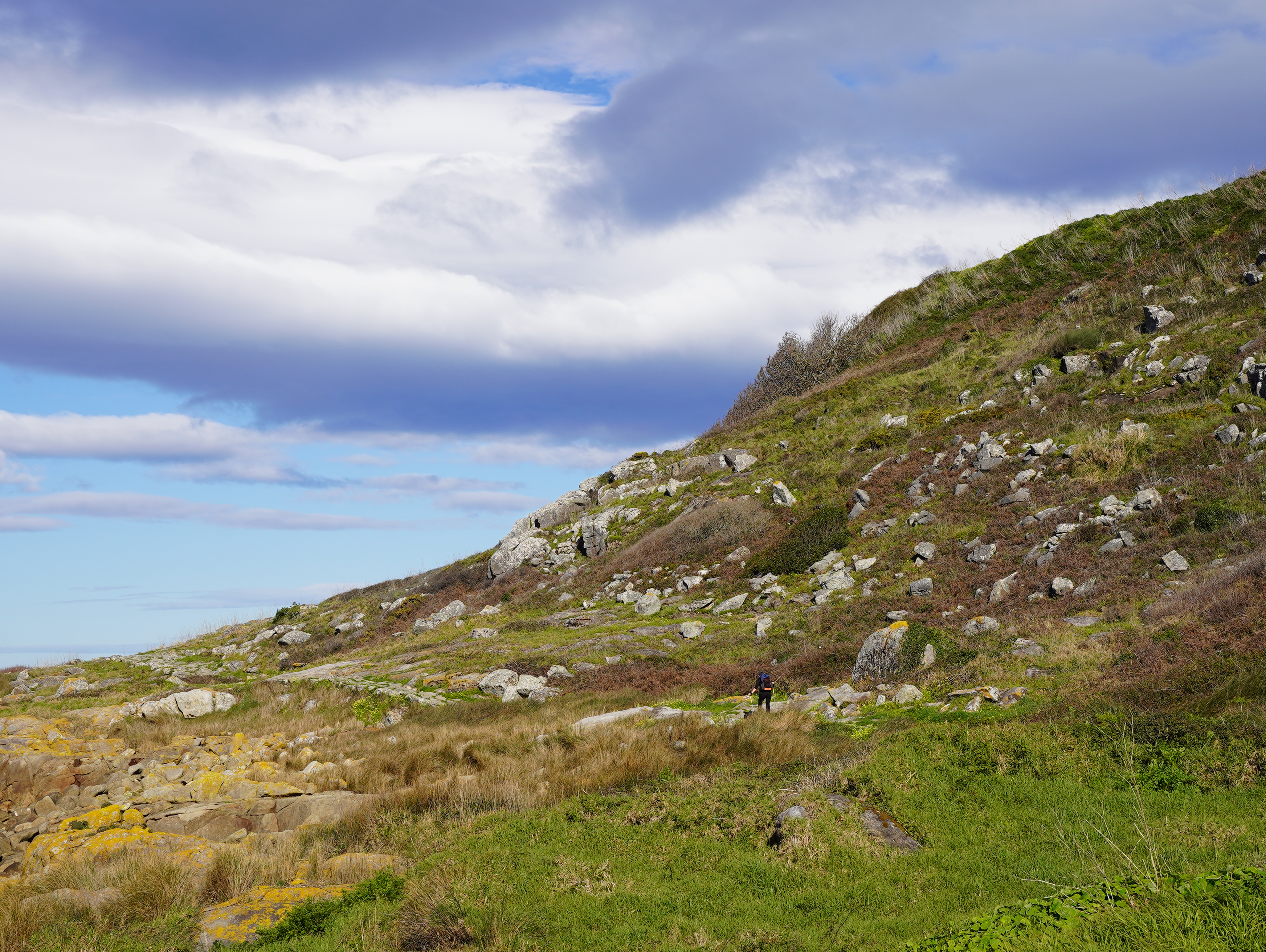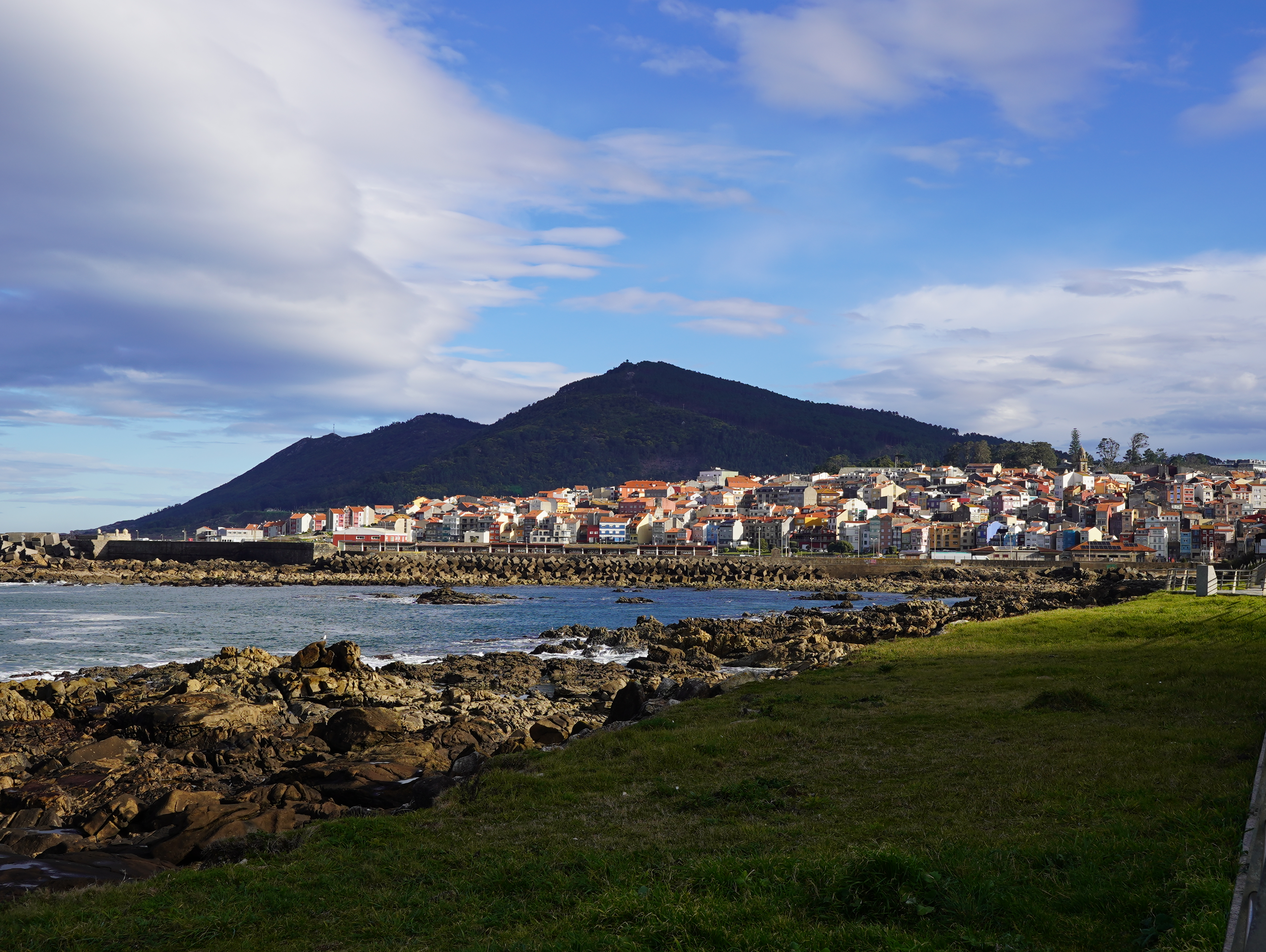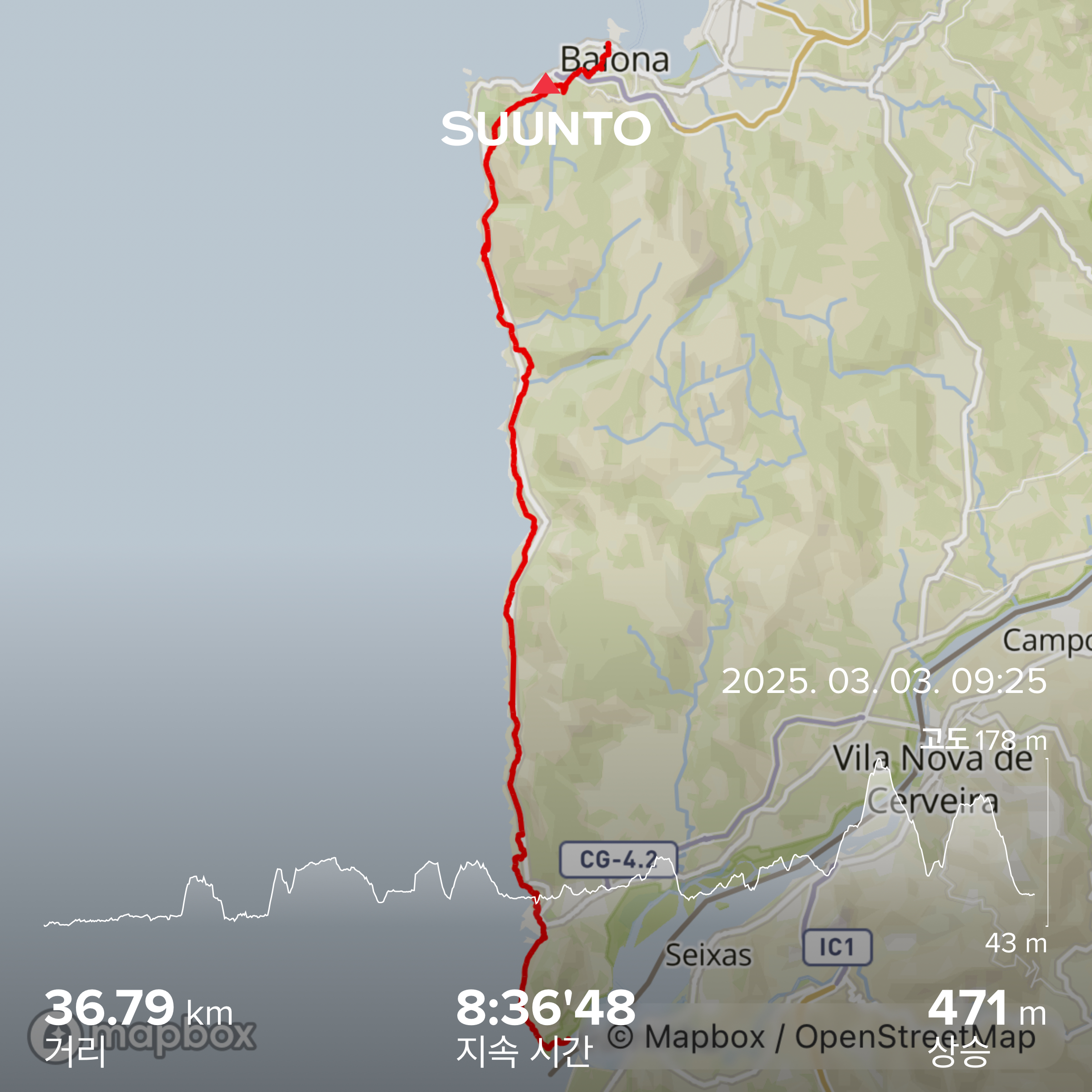 그렇게 Porto Mougas 마을의 아름다운 돌맹이 그림을 지나서 어느덧 산길로 접어들었다. 어디러 가는거지.. 30km 정도에 도달한때라 꽤 지쳐있었는데 점점 산으로 올라가는걸 보고 속으로 내가 너무 욕심을 부렸나.. 그런 생각이 들었다. 그럼에도 바로 앞에 보이는 돌산과 빨간 등대가 너무나 예뻐보였고 아래로 내려다보이는 바다와 해안가 마을이 열배쯤 더 멋져보였다. 역시 높은 곳에서 내려다보는게 제일 멋지다.